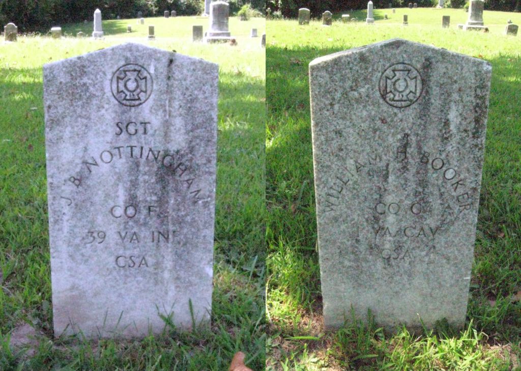 13. (Back) Sergeant John B. Nottingham enlisted at Williamsburg into Company F, 32nd Virginia Infantry Regiment (his grave records 39th Virginia Infantry Regiment) on 20 May 1861. He was captured at the battle at Appomattox Court House on 9 April 1865. Private William H. Booker enlisted into Company G, 1st Virginia Cavalry in 1861.