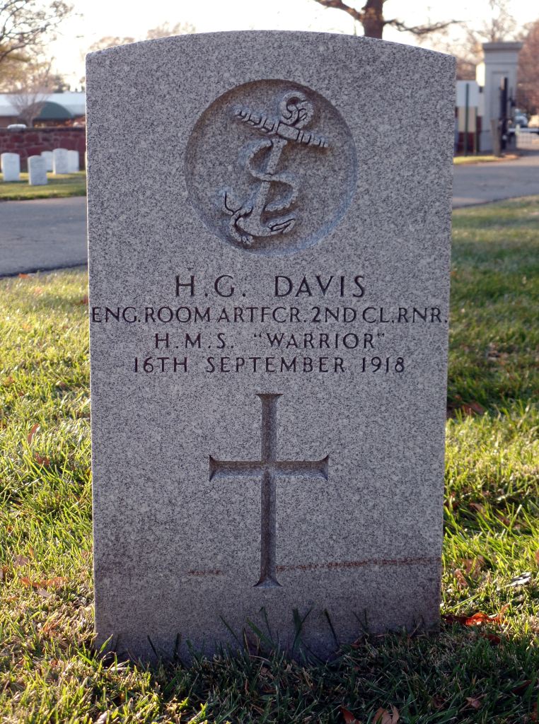 The log of HMS Warrior records 46 discharges to hospital between 6 August and 22 December—a substantial majority of her crew.[10] [11] Seven of these men succumbed to influenza, or to complications related to it in the New Naval Hospital at 23rd and E Streets NW.[12] They were buried in Arlington National Cemetery—the burial parties in all cases were provided by HMS Warrior’s crew.[13] With the exception of Harold Gurney Davis, all of the men are buried in Section 17, on the western side of the cemetery near the Confederate Memorial; Davis is buried nearby in Section 15A. The graves were originally marked with similar headstones to those used through Arlington National Cemetery but they have recently been replaced with Commonwealth War Graves Commission headstones.