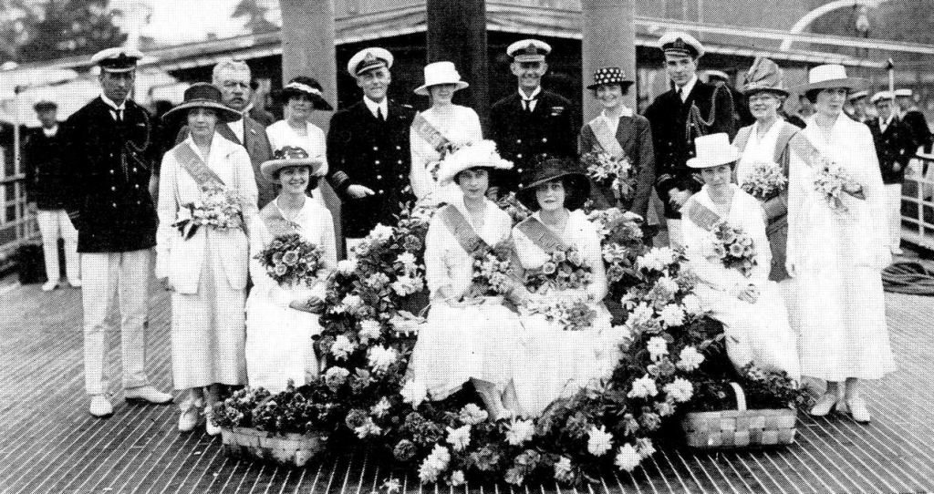 In addition to the routine of ships maintenance, the yacht’s compliment enjoyed liberty in Washington and took part in a number of ceremonies and social functions in support of Vice Admiral Grant’s role, many of which were hosted by his wife. The first large event of note was on Memorial Day, Thursday 30 May.[7] The commemoration in 1918 was unusual. A ceremony planned to commemorate those who died in the sinking of RMS Lusitania was widened to include all of those who had died up to that date in the war. It began on board HMS Warrior and then moved to the USS Wicomico, a yard tug; it was from the latter that large wreaths were ‘launched down the historic Potomac River and above which the ‘Union Jack’ had been raised’. The ceremony also featured ‘a bevy of American girls, flanked by a group of British jack tars, and hydroplanes circling above dropping flowers on the scene’.[8] Thereafter, the receptions and social engagements hosted onboard were a regular feature in the local press reports.