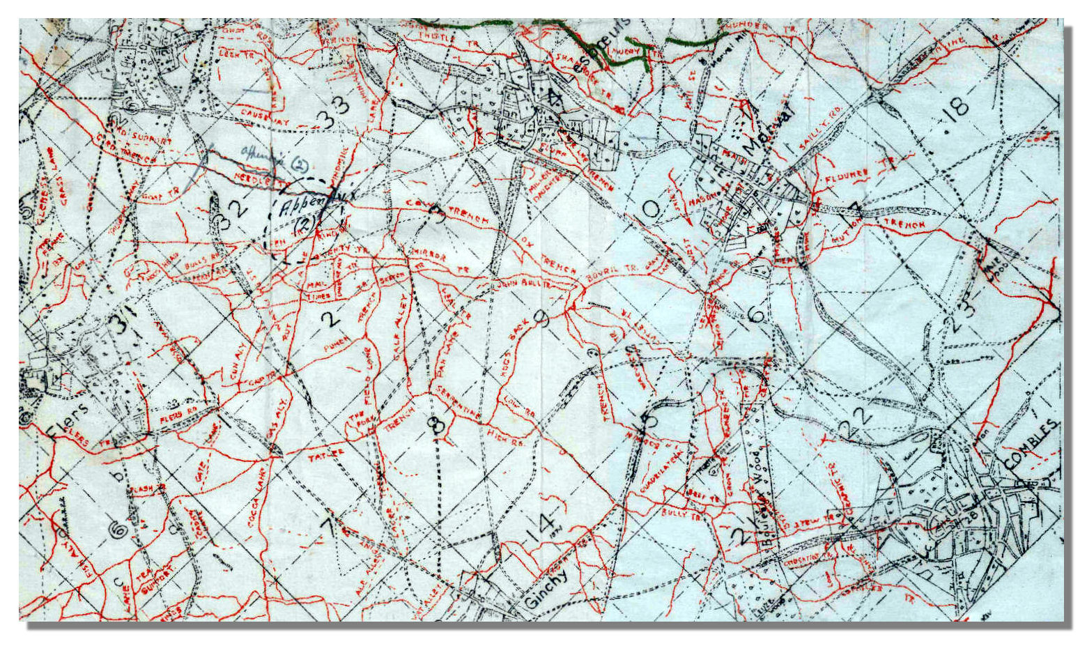 Ginchy is at the bottom centre of the map. The actions of 9th Suffolks on 13 and 15 September took place in grid squares 20 (unmarked), 21 and 15.