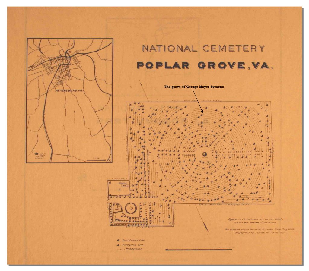 He was buried at Poplar Grove National Cemetery, Petersburg, one of seven burials in 1918.[14] Poplar Grove National Cemetery was established as a burial site for United States soldiers killed during the Siege of Petersburg. Confederate soldiers were buried at Blandford Church Cemetery. The work to clear the battlefield around Petersburg began in 1866 and was completed by 30 June 1869, when the burial corps that had carried out the work was disbanded. By then 6,178 Union and 32 Confederate soldiers, and five civilians had been buried in the cemetery; only 2,139 are identified. Since then there have been a further 32 Civil War burials (29 in 1931 and three in 2003) and 61 other burials between 1896 and 1957, when the cemetery was closed to non-Civil War interments.[15] George Symons is buried in grave 5596. It is in section C, in a radial row of graves established between 1896 and 1933 in the walkway in the centre of section C; it begins to the right of the gun monument and leads north-east. His grave lies between unknown soldiers in graves 3013 and 3014.