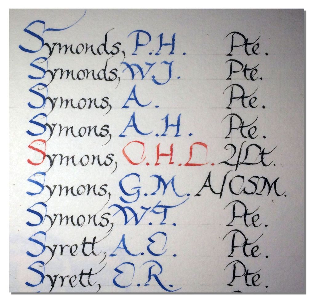 George Symons is also commemorated in the Royal Fusiliers Roll of Honour. This book of remembrance, dedicated with the regimental memorial on 4 November 1922, resides in the regimental chapel in St Sepulchre-without-Newgate at Holborn Viaduct, not far from the regimental memorial at High Holborn; both near to where George Symons was born.