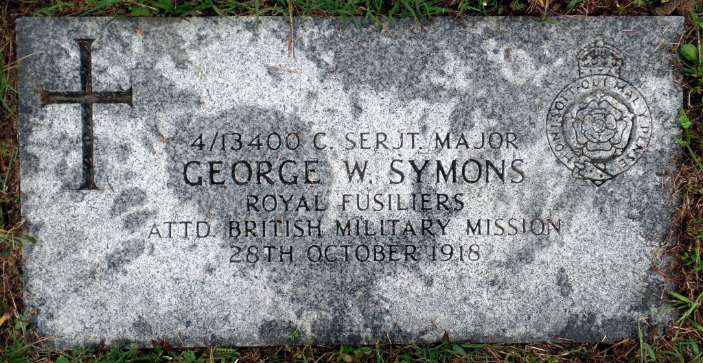 Company Sergeant Major Instructor George Symons was a pre-war regular soldier. In 1918 he was posted to the British War Mission in the United States, where he died at Camp Lee, Virginia on 8 October 1918 during the influenza pandemic.