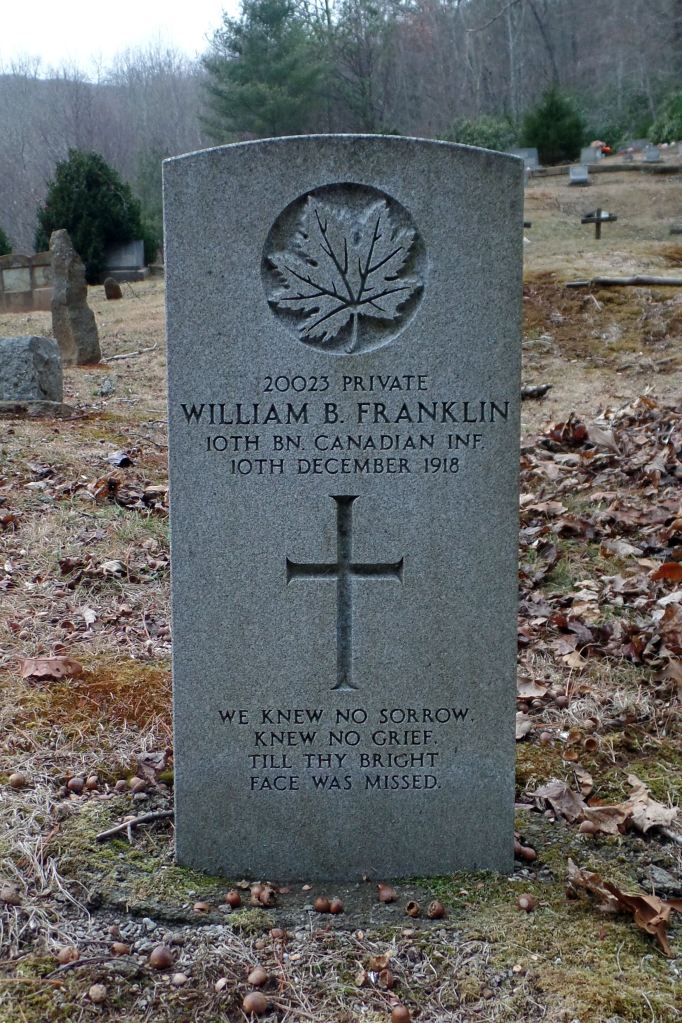 Private William Baxter Franklin is commemorated on page 410 of the Canadian First World War Book of Remembrance; that page is displayed on 4 September.