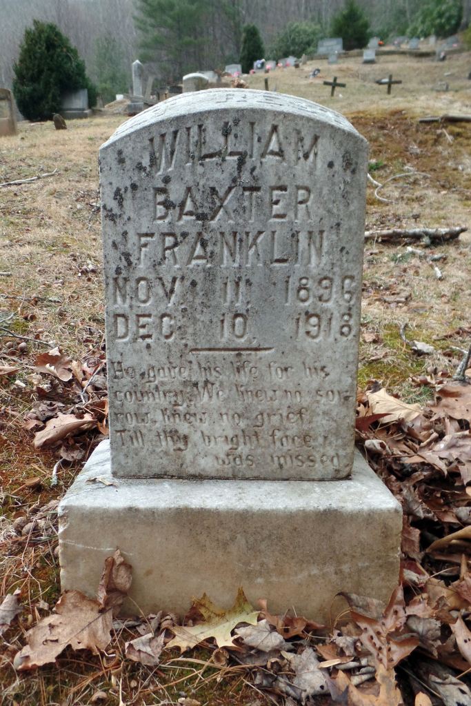 William Baxter Franklin was born on 11 November 1896 at Pigeon Township, near Canton, North Carolina. He was the fifth of the six children of John Baxter Franklin, a farmer, and Minnie Francis (née Penland).[1] A few days after his third birthday, Baxter Franklin’s father died. Minnie was unable to provide for the children and they went to live with her parents, Reed and Lavonia Penland. The young family moved with their grandparents to Medicine Hat, Alberta in 1902.[2]