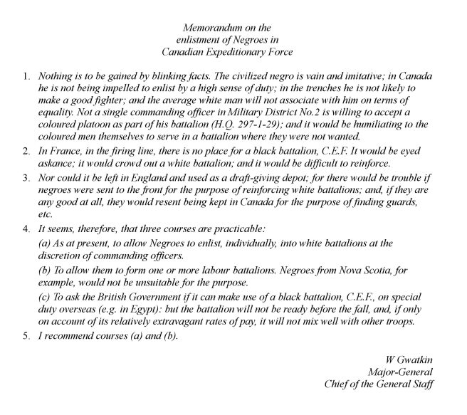 3. (Back) Ruck, C W. (1986). Canada’s Black Battalion: No.2 Construction, 1916-1920. Halifax: Society for the Protection and Preservation of Black Culture in Nova Scotia. p 114. Gwatkin’s memorandum, written on 13 April 1916,  is an excellent example of the prejudice of the day and is worth recording in full: