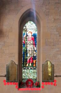 The window depicts Christ as Love. Underneath it is dedicated ‘To the Glory of God and to the memory of the men from this parish and neighbourhood who fell in the Great War 1914-1918 whose names are inscribed on the adjacent brasses‘. It was designed by Edward Burne-Jones and unveiled on 11 December 1920 by Lieutenant Colonel H E Joicey, the son of Lord Joicey, and dedicated by the Right Reverend John Quirk, Bishop of Yarrow.