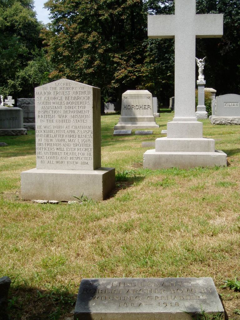 Major Bedbrook was admitted to a private sanatorium in Manhattan suffering from appendicitis, undergoing surgery on 21 April. In his subsequent report to the Military Attaché, Brigadier General Kenyon stated that Bedbrook ‘was doing quite well until the morning of the 1st May, when he had a relapse from which he did not recover.’[12] He was buried in Woodlawn Cemetery, Bronx on 4 May, where the grave was marked with a private memorial. His grave is in the north-east part of the cemetery in Section 141, Butternut Plot, Grave 14224W, and shared with Lieutenant R A Bowlby. There are six CWGC commemorations in Woodlawn Cemetery.[13]
