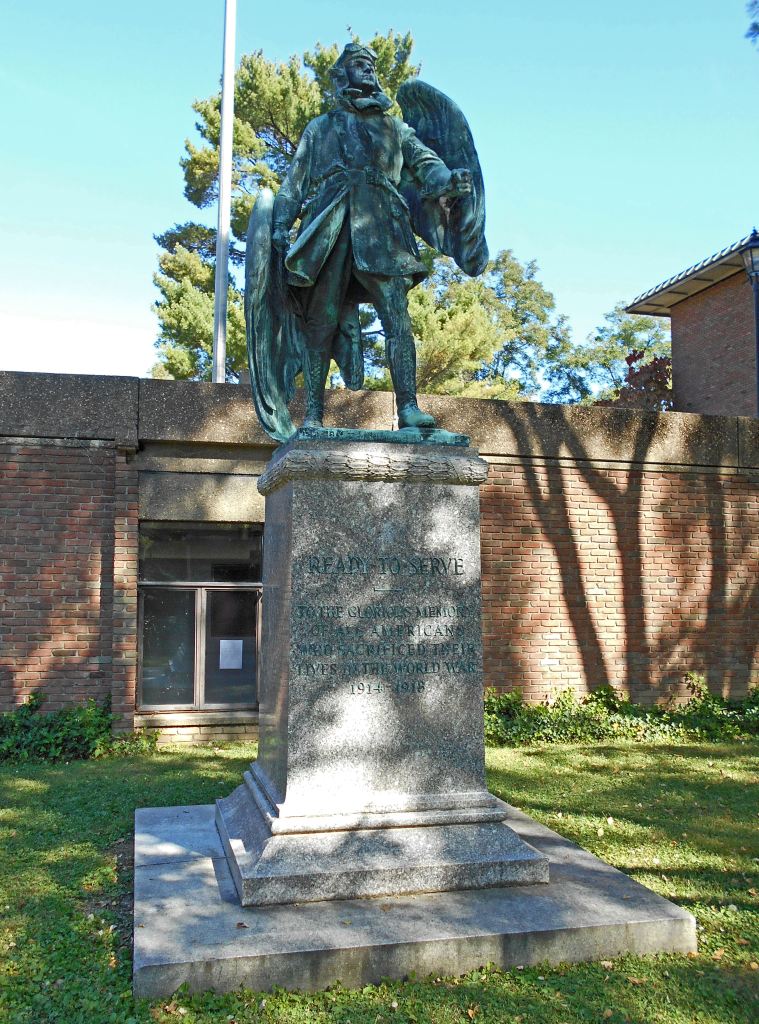 In gratitude for the help of the local village, she had a church built to commemorate her son with a small monument next to it. For the next six years, she actively sought to memorialize her son across borders and continents. Besides the church in France, she donated a statue of George Washington to a Paris museum. She commissioned a sculpted wreath at the Cenotaph in London and a memorial RFC window in Westminster Abbey. At home in the United States, she dedicated an airport, donated a tapestry, and sponsored a parachute contest in her son’s memory. Her crowning achievement was to commission a statue by a noted sculptor and place it in Wheeling, the city where her son’s dream became reality. In all, she dedicated some twelve memorials to him.[8]