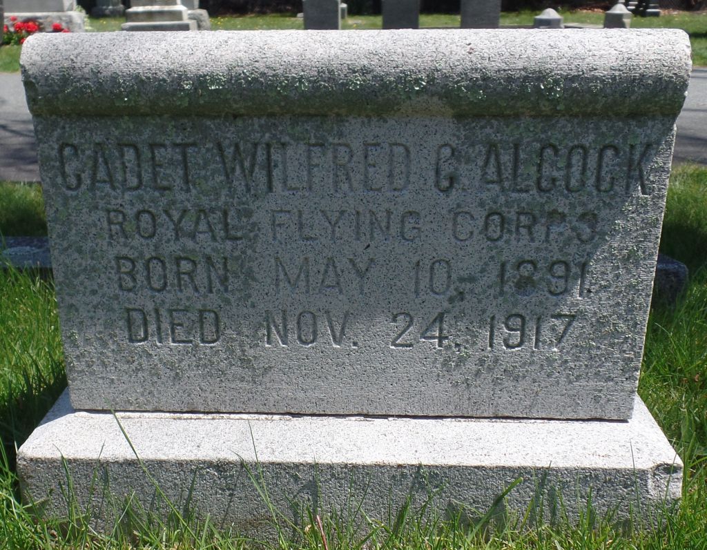 Cadet Wilfred Cecil Alcock is commemorated on page 575 of the Canadian First World War Book of Remembrance; that page is displayed on 13 December. He is also commemorated on the war memorial in Over Knutsford, at the junction of Mobberley Road and Thorneyholme Drive, and on the Royal Flying Corps/Royal Air Force memorial in Greenwood Memorial Park, Fort Worth, Texas.