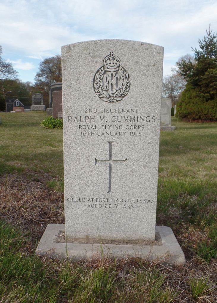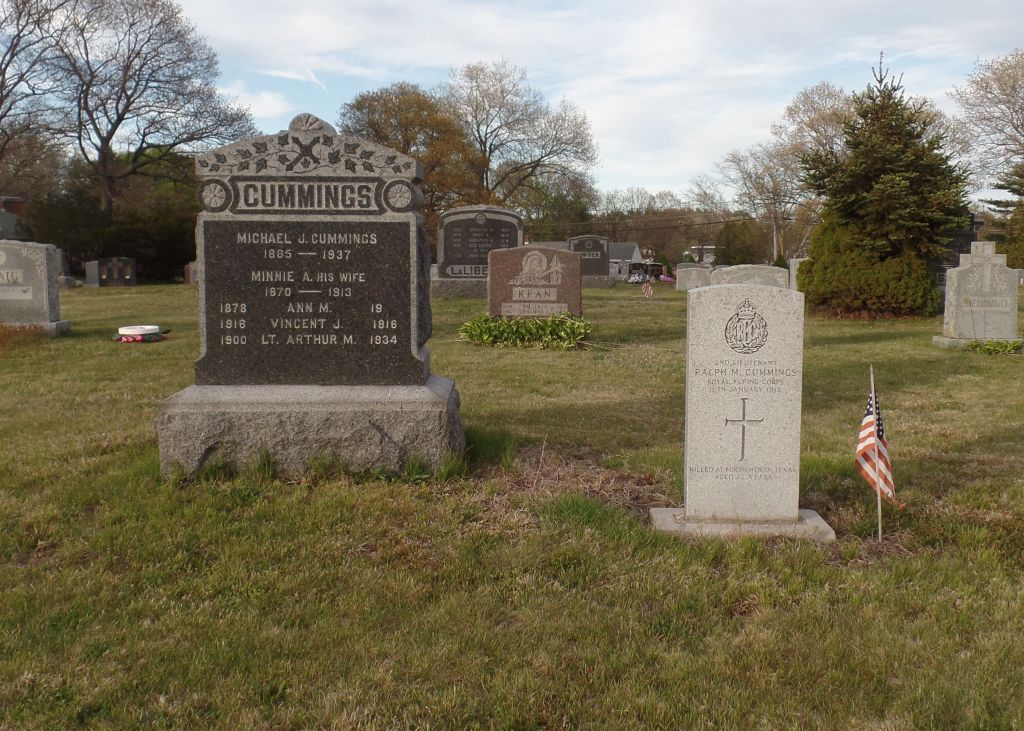 At some stage in his training, Cummings had travelled to Texas to fly and by the turn of the year he was attached to the School of Aerial Gunnery. On 15 January, he was involved in an accident in a Curtis JN4, the cause of which was not determined by the subsequent board of inquiry. Also in the aircraft was Napoleon G. Ouellette, a soldier serving with the Air Service, United States Army.[2] Ouellette was only slightly injured but Cummings was seriously injured and he died the next day. His remains were sent home and he was buried in Saint Michael’s Cemetery, Avon. His parents and brother are also buried there. His grave is in the eastern part of the cemetery in Lot 128 marked with a Commonwealth War Graves Commission headstone; a large family marker is nearby.
