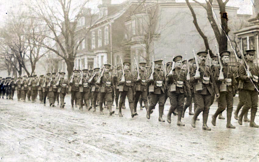 (Photo Percy Willmot, 25th Battalion, CEF: Marching in street. 84-79-14179. Beaton Institute, Cape Breton University.)