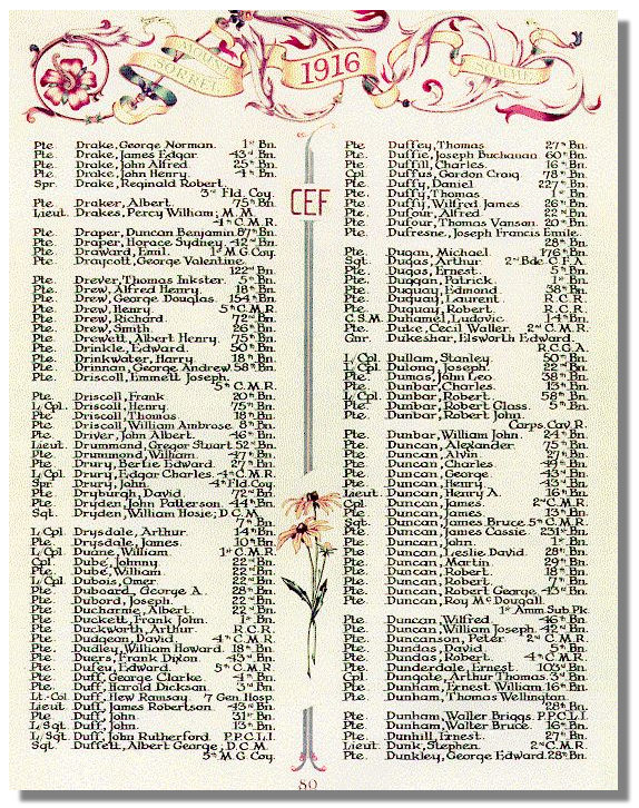 Private Michael Dugan is commemorated on page 80 of the Canadian First World War Book of Remembrance; that page is displayed on 27 February. Having served only in Canada he was not entitled to any medals but his memorial plaque and scroll and the Memorial Cross were sent to his wife, and a Memorial Cross was sent to his mother in Corry. He is commemorated also in the memorial booklet Erie County Pa. in the World War 1917-1919.[3]