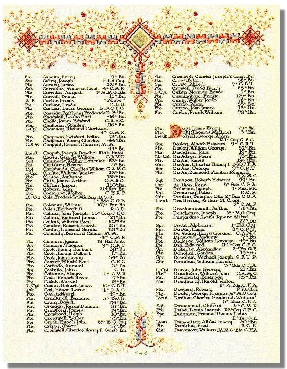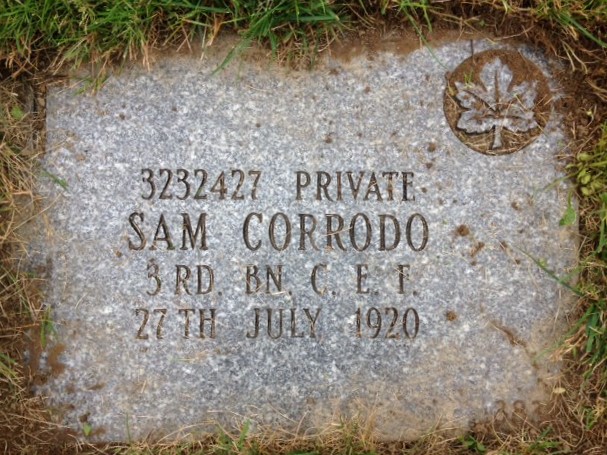 Private Sam Corrodo is commemorated on page 548 of the Canadian First World War Book of Remembrance; that page is displayed on 22 November. For his war service he was awarded the British War Medal 1914-20 and the Victory Medal. His medals, memorial plaque and scroll and the Memorial Cross were sent to his wife.