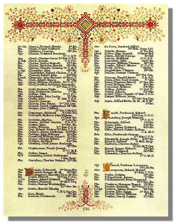 For his war service he was awarded the British War Medal 1914-1920 and the Victory Medal. His medals, memorial plaque and scroll, and Memorial Cross were sent to his widow. Private Alfred Moore Downs is commemorated on page 556 of the Canadian First World War Book of Remembrance; that page is displayed on 28 November.