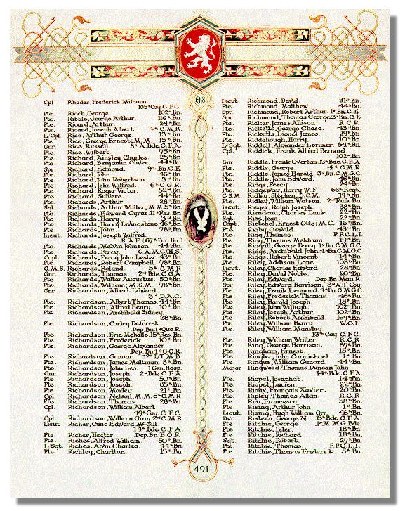 Private C. D. Richardson is commemorated on page 491 of the Canadian First World War Book of Remembrance; that page is displayed on 17 and 18 October. He did not earn any medals for his brief war service. His memorial plaque and scroll were sent to his brother Walter in 1921. With no female relatives, a Memorial Cross was not issued.