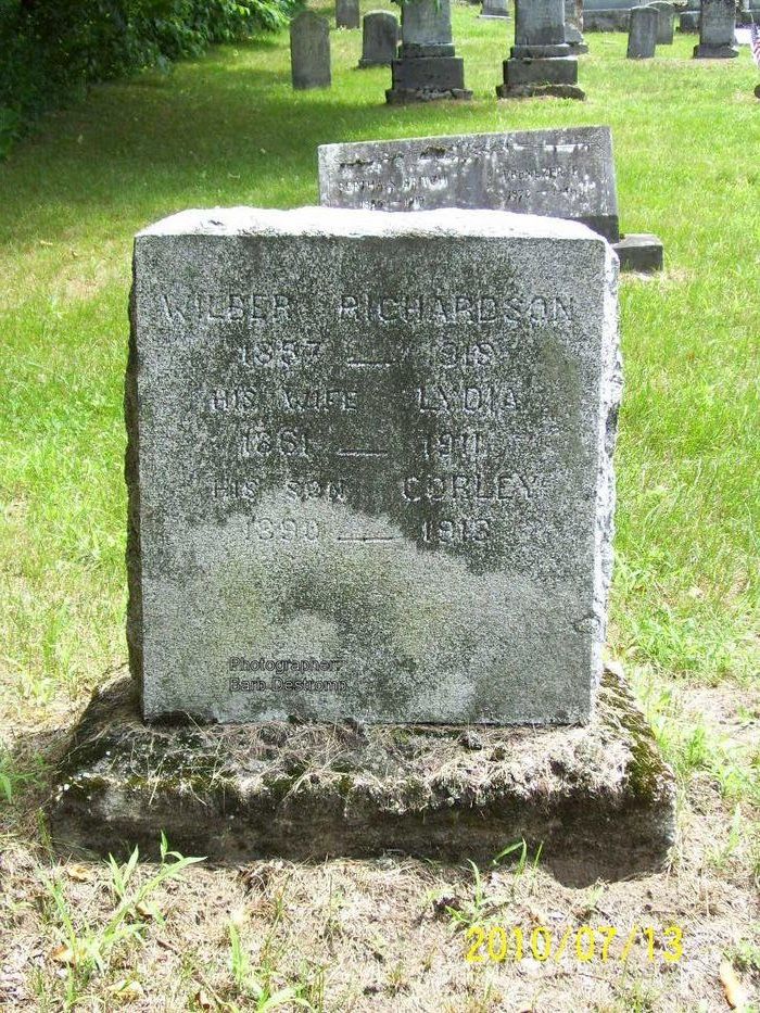 1. (Back) Wilber Benjamin Richardson (13 June 1857-1 June 1918) married Lydia Almyra Brown (21 February 1861-11 May 1911) at Richford, Vermont on 4 June 1881: Walter Herman (10 January 1882-NK); Charles Wallace (1884-24 August 1888); Percy Wilber (12 June 1897-8 March 1873).