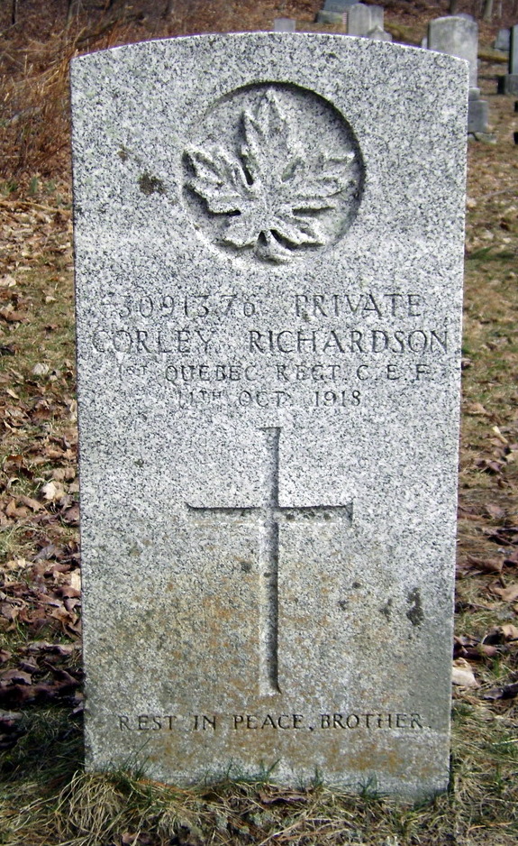Corley Deferest Richardson was born on 16 March 1890 at Glen Sutton, Quebec, the third of the four sons of Wilber and Lydia Richardson.[1] His parents were both Canadian but were married in Richford, Vermont in 1881—the family lived at several places either side of the border and moved to East Richford in 1901. After leaving school Corley Richardson worked in the area as a labourer in a box factory, as a cook and as a mill hand.