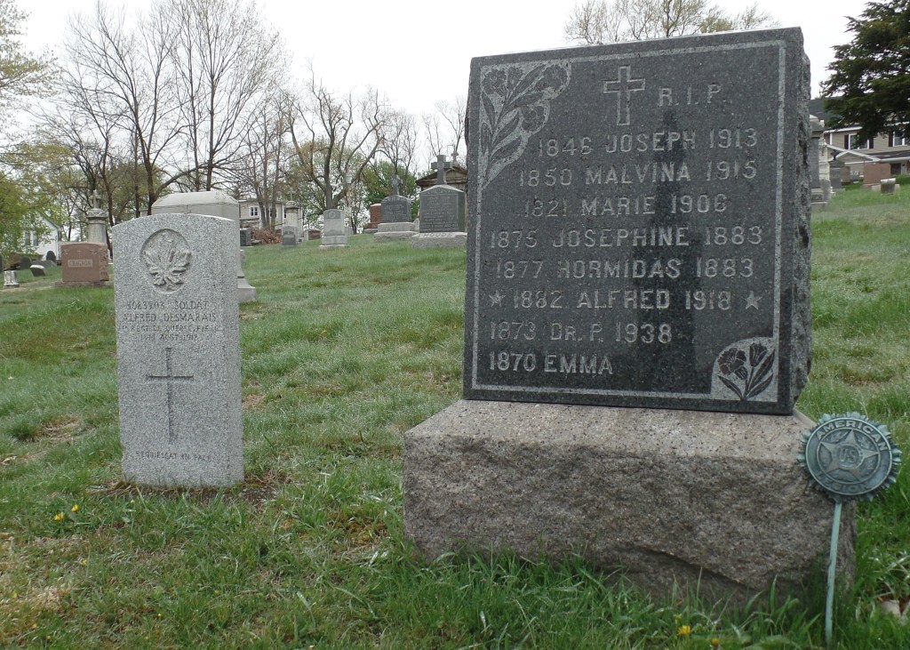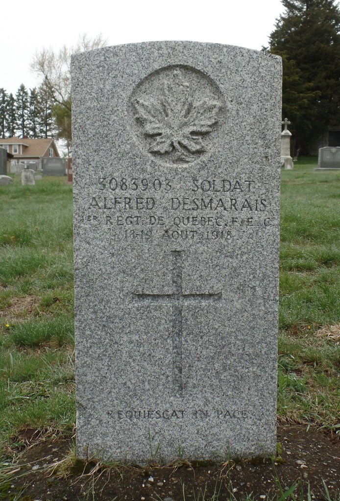 Desmarais enlisted on 23 April 1918 at Montreal and joined 1st Depot Battalion, 1st Quebec Regiment and was allocated the number 3083903. Although transferred to the 8th Overseas Draft in mid-May, while at Halifax prior to embarkation Desmarais had a ‘fit’ and was sent for examination at the Station Hospital. Diagnosed with epilepsy, his medical category was reduced firstly to ‘C-1’, fit for garrison service, and then to ‘E’, unfit for further service. He was readmitted to hospital on 9 August having had another seizure but the doctor examining him stated that he did not see a reason to admit him to hospital every time he had an episode because he was awaiting discharge. Desmarais was sent to Saint-Jean-sur-Richelieu to await final processing an accommodated at the National Hotel. He died there in his sleep on the night of 18/19 August 1918 having had another seizure. His remains were returned to his family and he was buried in Saint Mary’s Cemetery, Marlborough. His grave (L-517) is in a family plot.