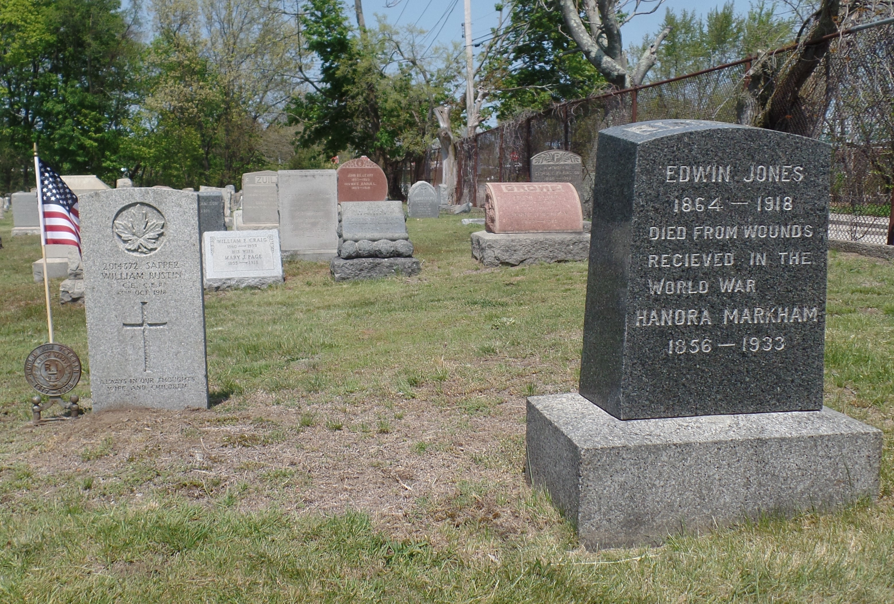 The grave to the right is that of Edwin Jones, a British soldier who was a naturalized US citizen, and a long-time resident and police officer in Providence. He was wounded or gassed and discharged from the British Army in 1918 and, having returned home, died in Providence on 5 September 1918. He is not commemorated by the Commonwealth War Graves Commission and his story warrants further research.