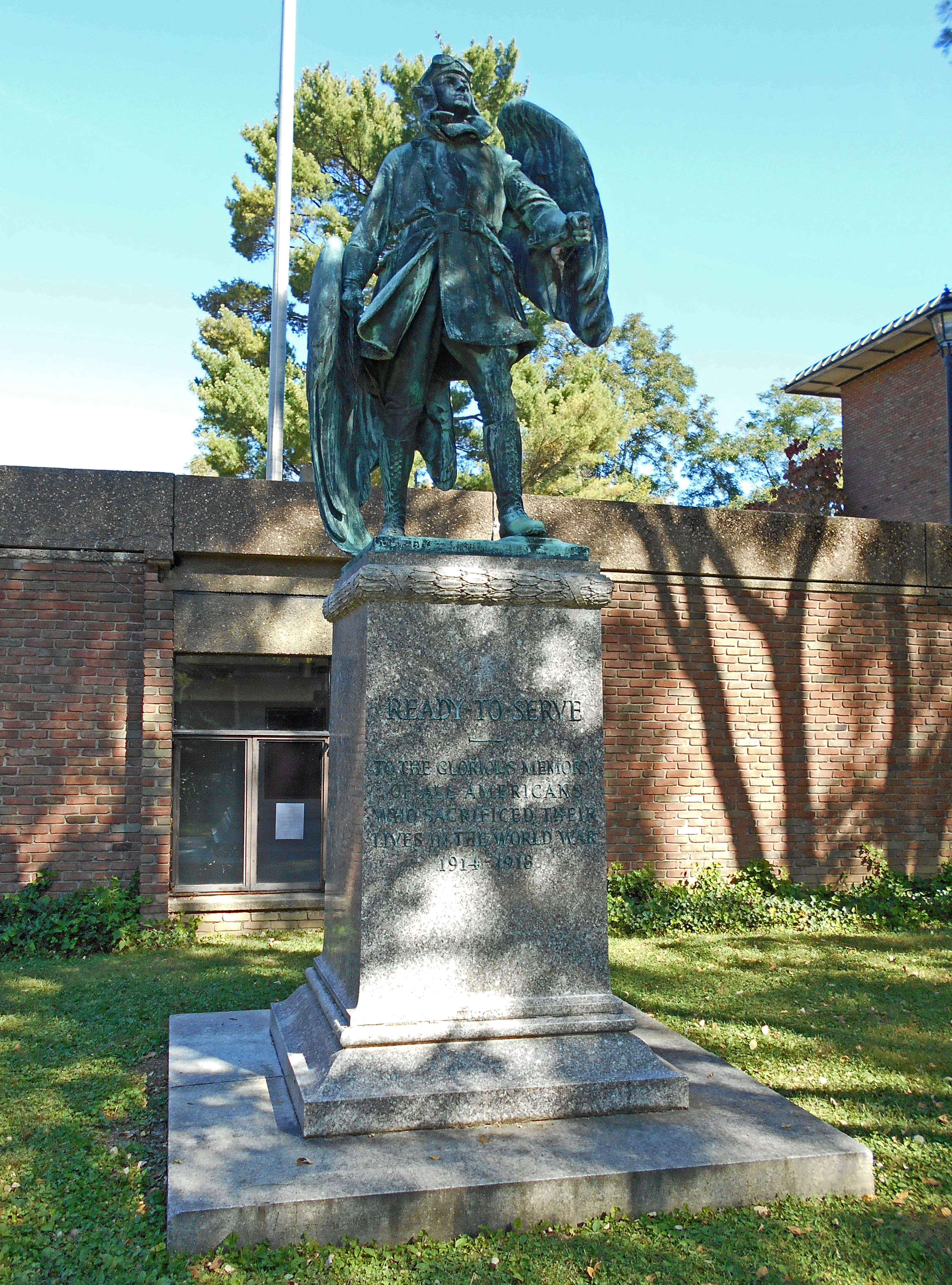 The statue was cast in bronze by the sculptor Augustus Lukeman and erected on a granite base in the grounds of the all-boy Linsly Military Institute—now the co-educational Linsly School—in Wheeling, West Virginia. It was unveiled by Sallie Bennett on Armistice Day, 11 November 1925 and inscribed: